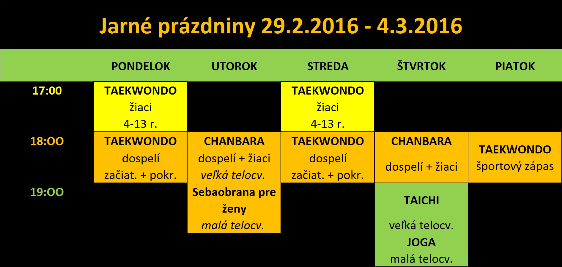 Počas jarných prázdnin sme zmenili rozpis tréningov. Po týždenných prázdninách sa pôjde opäť v normálnom harmonograme :)